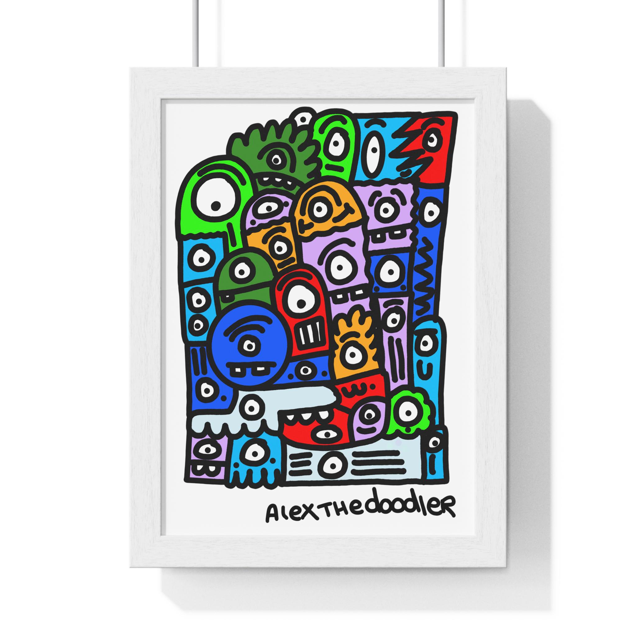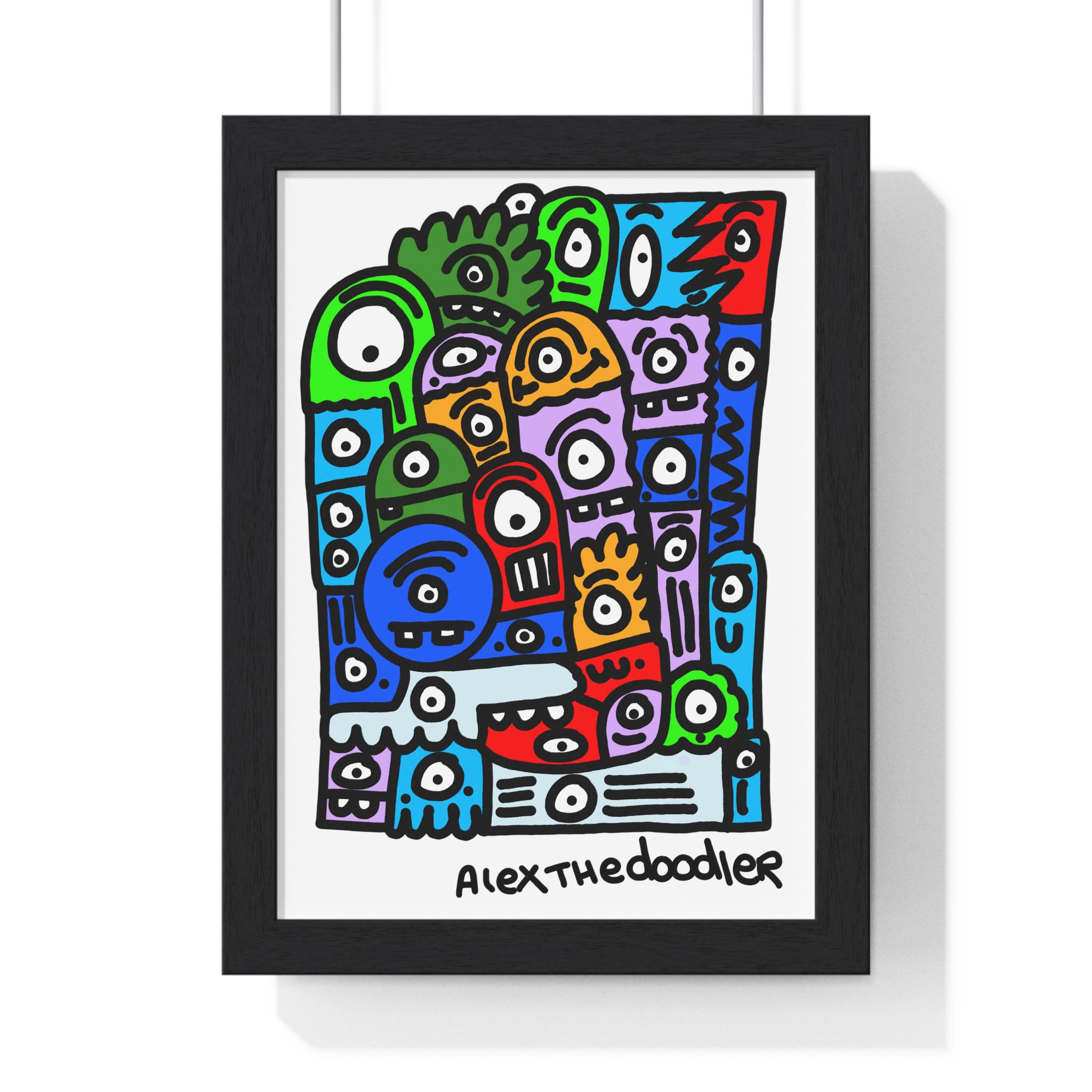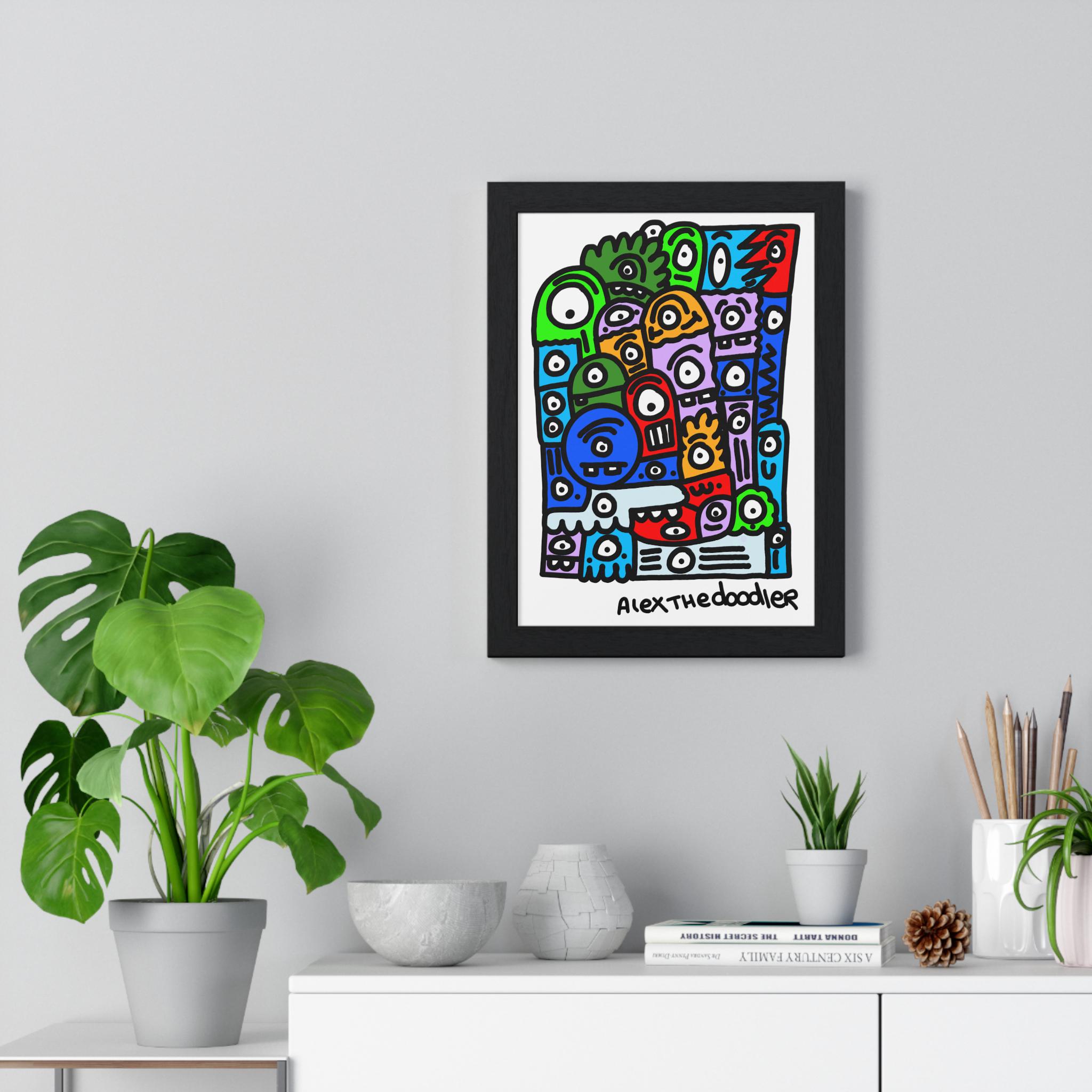 This vertical framed poster brings bold, playful energy to any indoor wall. Hand-drawn doodle characters burst in saturated pigment-ink colors on matte museum-grade paper, protected by a plexiglass front and set inside a clean wooden frame. The pre-installed hanging hardware makes installation quick and secure, and multiple size options let you choose the scale that fits your space — from a focused nook to a colourful gallery grouping. Crisp archival materials ensure the artwork stays vivid without yellowing, so the piece keeps its charm for years.